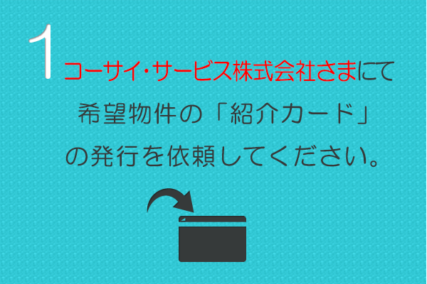 提携特典をうけるためには、コーサイ・サービス株式会社さま発行の「紹介カード」が必要です。